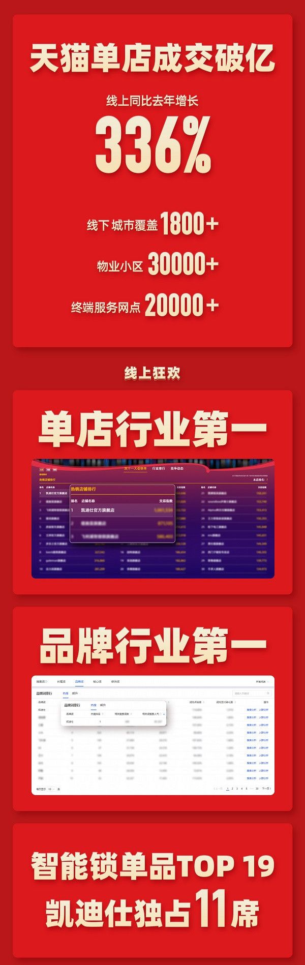 从线上表现来看,凯迪仕天猫单店成交破亿,线上同比去年实现了336%的大幅增长,更夺下单店行业第一、品牌行业第一、店铺流量&收藏&加购第一、明星网红直播力荐款式数量第一等多项佳绩,在智能锁行业单品TOP 19中,凯迪仕凭一己之力独占11席,以强大的产品实力赢得市场和消费者青睐。