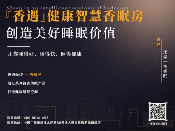 香遇品牌管理(广州)有限公司专注于沉香原材料纺织黑科技的创新研究,把沉香安神助眠的药理,应用到日常睡眠空间。在产品研发上,香遇将产品与人工智能物联技术相结合,为高端酒店、民宿和家庭卧室等提供健康智慧睡眠和产品配置服务,打造香遇品牌的"健康睡眠主题空间",为人类的健康睡眠事业不懈努力。关注"香遇香眠"公众号,第一时间获取最新资讯!香遇全国服务热线:400-8016-453 。