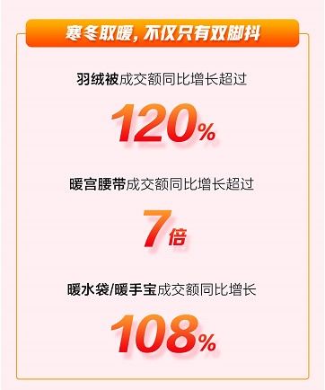 漂亮的居家环境营造幸福感,但要挨过这个“拉尼娜”年,保暖才是硬道理。11月11日,羽绒被成交额同比增长超过120%,暖宫腰带成交额同比增长超过7倍,暖水袋、暖手宝成交额同比增长108%。11月1日至11日期间,95鹅绒被成交额同比增长超过100%。