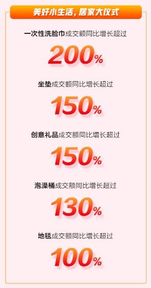 生活还是需要一些仪式感的,一个精致的居家环境,需要一些小美好来点缀。看脸的时代,洗脸也是大事,11月11日,一次性洗脸巾成交额同比增长超过200%,11月1日至11日期间同比增长超过300%;精致的生活,洗澡更不能含糊,11月11日泡澡桶成交额同比增长130%,11月1日至11日期间成交额同比增长超过4倍。此外,11月11日,创意礼品成交额同比增长超过150%,坐垫成交额同比增长超过150%,地毯成交额同比增长超过100%。