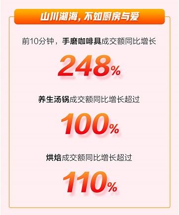 人们最向往的美好居家生活不一定奢华,但一定是“有人问你粥可温”,用心烹饪的美味胜过千言万语。11月11日前10分钟,能“磨出幸福感”的手磨咖啡具成交额同比增长248%,11月1日至11日期间成交额同比增长超5倍。养生汤锅11日前10分钟同比增长超100%,烘焙成交额同比增长超过110%。