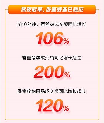 当代年轻人虽然个个都是熬夜冠军,但他们对睡个好觉这件事却非常重视,卧室装备必须到位。11月11日前10分钟,蚕丝被成交额同比增长106%,香薰蜡烛成交额同比增长超过200%,卧室收纳用品成交额同比增长超过120%。