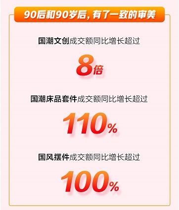 都说时尚是一个轮回,美好的东西不会被审美代沟阻隔,90后的年轻人和90岁后的爷爷奶奶们也能有同样的审美。11月11日,国潮文创产品备受年轻人推崇,成交额同比增长超过8倍,国风摆件成交额同比增长超过100%;还有不少人睡觉也要赶时髦,国潮床品套件成交额同比增长超过110%。