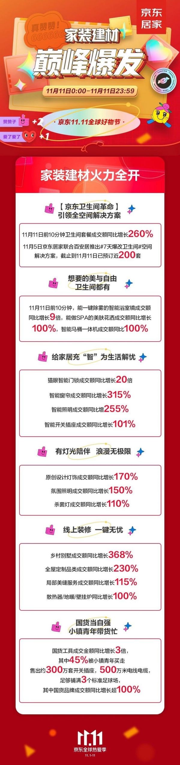 作为2020年最盛大的全民购物盛宴,京东11.11全球热爱季以史上最大优惠力度、最强合作品牌、最佳服务体验,最大化满足消费者需求。在家装建材领域,京东充分发挥主场优势,为消费者对品质生活的热爱而奋力行动,引爆全民家装狂欢。11月11日当天,前1小时,卫生间套餐成交额同比增长140%;11月1日-11日,京东智能家居品类成交额同比增长超100%,局改微装需求旺盛,国货工具成交金额同比增长3倍。不仅是消费者的购物热情得到充分释放,京东11.11也助力家装建材商家勇攀销售高峰,300个品牌成交额同比增长超5倍,C2M强势拉动销售增长。
