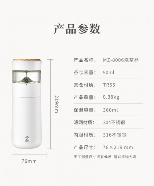 很多人在选择保温杯的时候,首先要看的就是杯子的材质,鸣盏泡茶保温杯的材质方面使用的是316不锈钢无缝内胆,具备高真空隔热层,可以12小时长效保温且耐腐蚀,而茶水分离和独特冲泡功能,又能大大保证茶水的风味和营养价值,喝的安全又健康,才是年轻人品茶的正确打开方式。