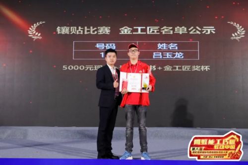 他叫吕玉龙,一位帅气的80后匠人,也是两个孩子的父亲。从业16年,每一次铺贴的专注与不断进步,让他从一名学徒成长为有口皆碑的好师傅。也正是多年来坚持不懈的努力与钻研,让他一举拿下华南片区总决赛金工匠的荣耀。