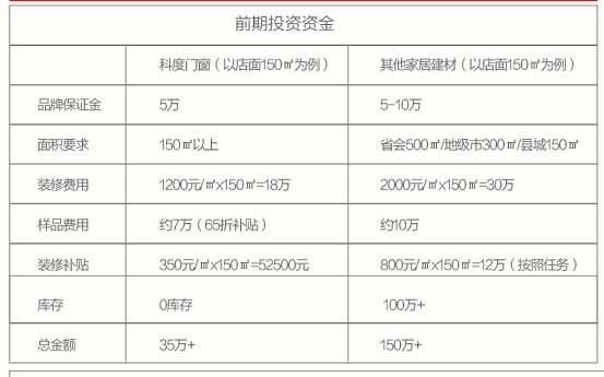 以一家150m2的店面为例,我们针对前期投资资金,来对科度定制门窗店和其他家居建材店做个细项对比,请看下表,嬴在起跑线,科度胜!