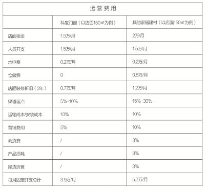 (科度定制门窗店与其他家居建材店运营费用对比表)