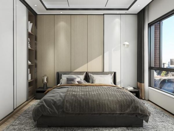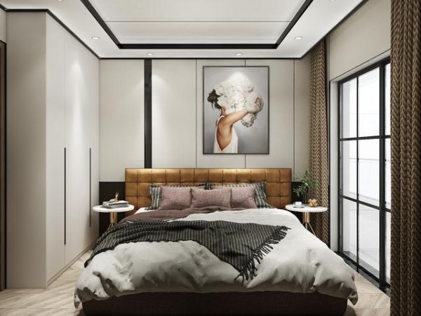 卧室背景墙用了栗子木和浅白布纹,浅色系的搭配,远离都市的嘈杂,交织成静谧清闲的幸福时光。