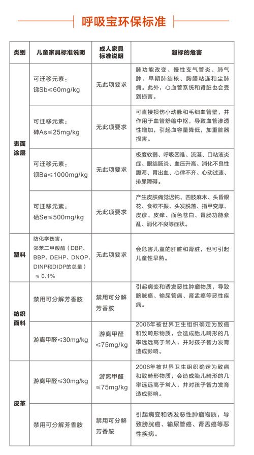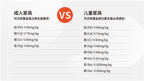 家长们要知道,成人家具没有对锑、砷、钡、硒这四项重金属释放标准进行规范,儿童心肺发育不健全,这些重金属一旦超标,很可能对孩子的心血管系统、肺功能及肾脏等器官造成不可逆的损害!