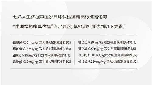 此外,七彩人生开创三宝体系中的呼吸宝,同样严苛规定了表面涂层可迁移元素、纺织面料、皮革等指标。