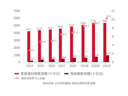 2019年家居建材整体市场规模达到5.4万亿,线下销售规模约49450亿,电商销售规模约4610亿;2020年销售规模预计达5.7万亿,线下销售规模预计51600亿,电商销售规模预计5440亿。面对万亿级别体量市场,近些年,天猫、京东、拼多多等巨头纷纷入场布局,江湖硝烟,按照近些年外卖市场、打车出行市场、共享单车市场、充电宝市场等巨头介入行业市场格局看来,决战紫禁之巅这一战也势必将会很快到来。