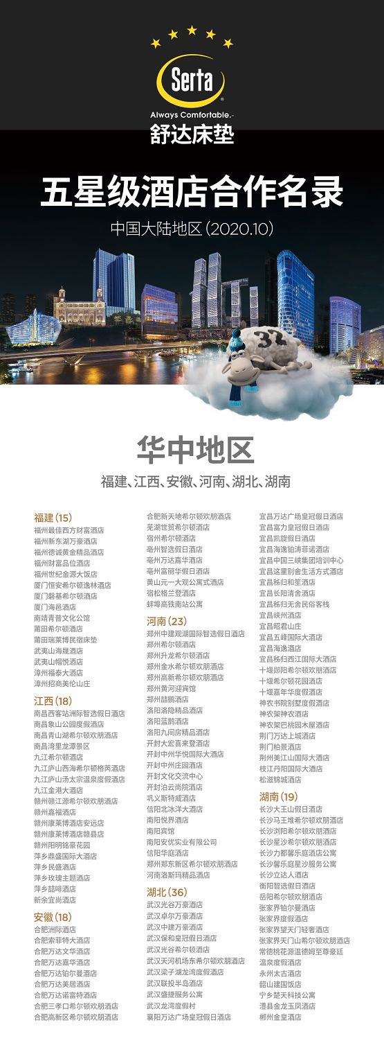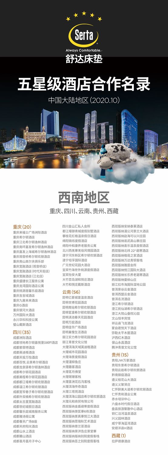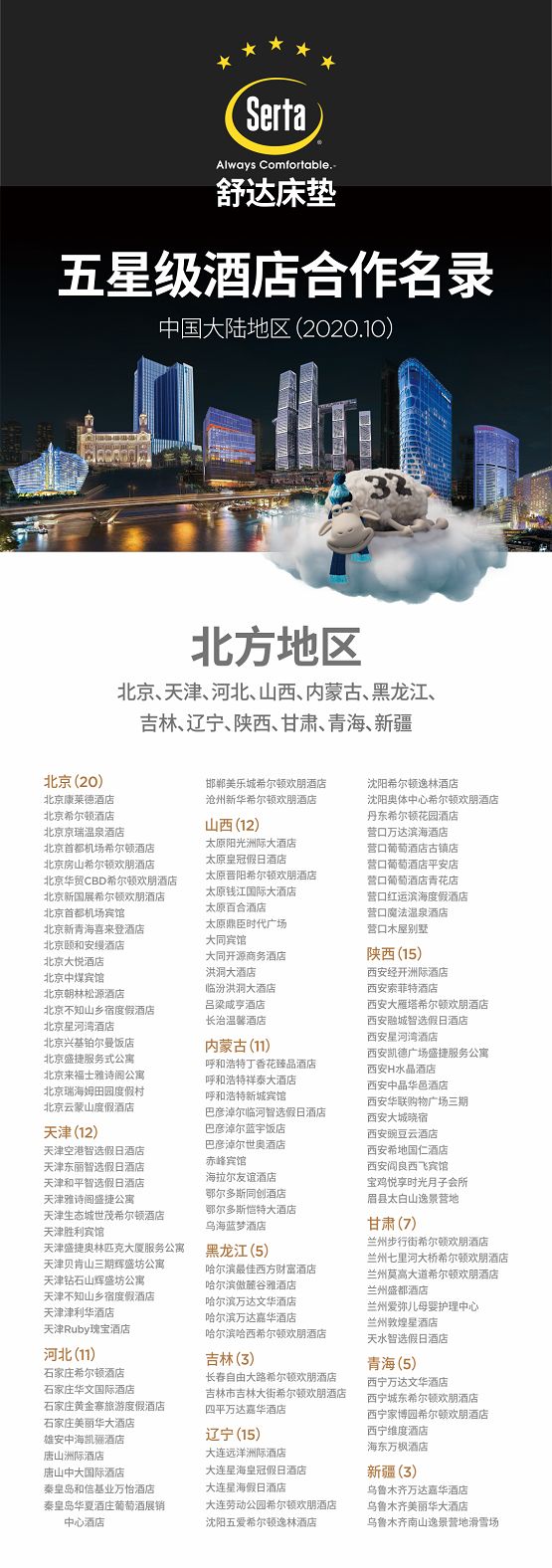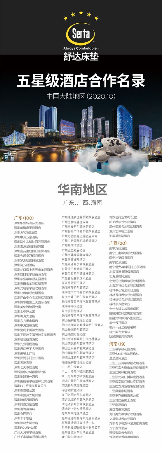2020年,舒达床垫在中国大陆地区酒店合作项目累计数再创新高,历史性地突破了600家大关。新增酒店中,不乏洲际酒店集团、万豪酒店集团、希尔顿酒店集团等三大国际酒店品牌,还有很多本土酒店也纷纷采买高品质的舒达床垫!跟随舒小羊一起看看,中国大陆地区哪些酒店与舒达床垫合作?