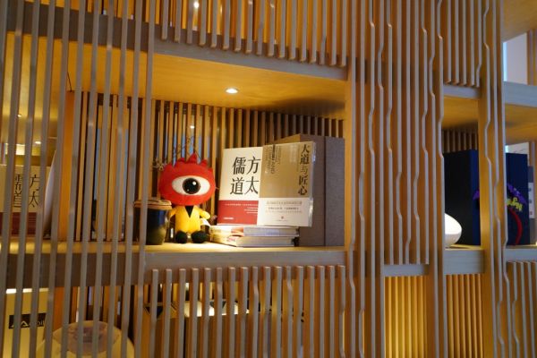 方太作为国货品牌,一直推崇国学。在每一楼层的拐角处都印有一句儒家经典名言。馆内多处设置木质书架、隔断,放置古典书籍,供来客翻阅。