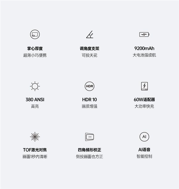 坚果M7配置了全新TOF激光自动对焦,1秒钟画面立刻清晰,几乎一瞬间就能看到投影画面。还支持四角校正功能,就算你侧着投,背着投,还是正面投屏,画面方方正正,给你最完美的画面。画质方面,拥有HDR10解析能力,兼容1080P,流明亮度达到250ANSI,在轻便型智能投影仪的各类产品中非常有竞争力。同时,坚果M7还配置了AI蓝牙语音和智能操控系统,轻轻一按立即唤醒,轻松遥控投影仪,方便快捷。