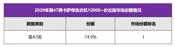 而对于分区洗的选购标准,从数据可以看出,市场呈现一家独大的趋势。47周数据显示,卡萨帝万元以上份额为74.9%。