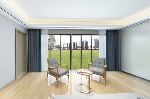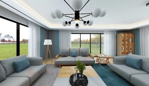 客厅很宽敞,以淡雅的灰色与白色为主基调,再辅以实木色和少许蓝色,使其更具有层次感。