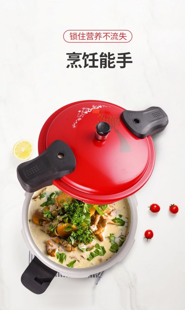 双喜中国结微压锅由铝锰钛新型铝合金材料制成,它具有白色仿麦饭石健康不粘涂层,久用不粘,压力盖加玻璃盖双盖设计,可以让烹调的过程有了丰富的选择。高温烤漆的外观,“添彩”的效果除了中国结微压锅富丽喜庆的中国红,还有多种色彩和团,装点着纯净、安然、一点点的幸福生活家的味道。