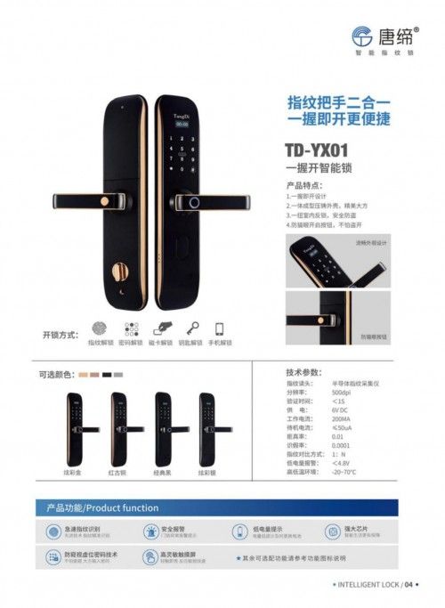 智能锁挑选过程中可以根据自身喜欢选择外观、有无联网、人脸识别、可视猫眼等个性化功能。唐缔智能锁拥有强大的研发能力,与时俱进,开启智能家居新时代。产品从外观到结构再到功能均为上品拥有炫彩金、红古铜、经典黑、炫彩银等多色可选;具备指纹解锁、密码解锁、磁卡解锁、远程解锁、钥匙解锁等多种解锁方式,功能丰富,可以满足不同人群的需求。