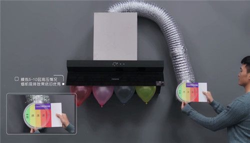 为了让用户直观感受智慧12方油烟机在家庭厨房真实使用环境下的效果,卡萨帝做了一个实验:用道具档住烟道的排风口,模拟一幢33层高的住宅楼内不同楼层的烟道压力,遮挡越多,压力越大。结果发现,即使模拟到5层这样的低楼层时,智慧12方油烟机仍能稳稳吸住彩色气球,吸排效果优秀。而对传统大吸力油烟机来说,这样的烟道压力下,吸力就难保证,难免会出现油烟外逸、排不干净的现象。