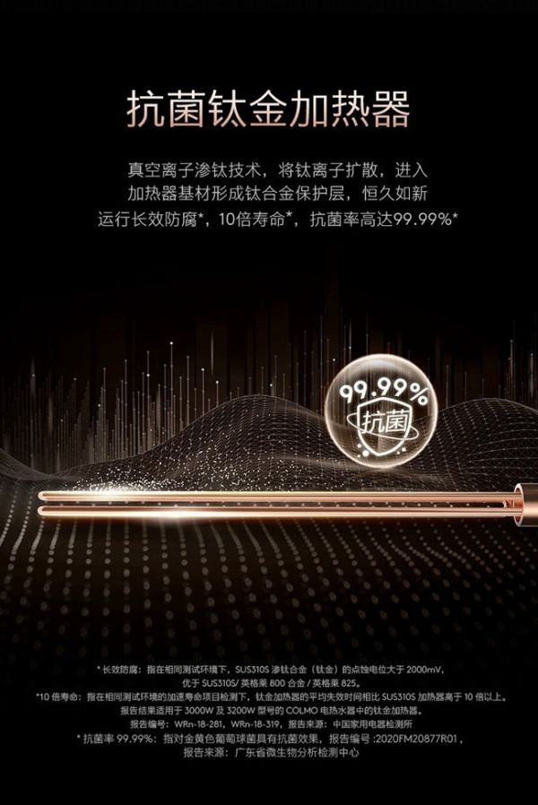 COLMO 电热水器专利钛金加热器,采用真空离子渗钛技术,让钛离子融入加热器基材形成钛合金保护层,抗菌率高达99.99%,鲜活水源滋养身体,也加热器能够长效防腐,拥有较普通加热器10倍的使用寿命,热水器运行恒久如新。