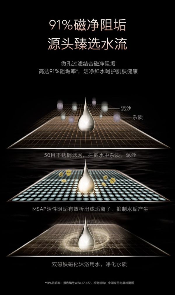 COLMO电热水器设置磁净阻垢阀,50目不锈钢滤网可以轻松阻挡水源中混入的泥沙杂质,MSAP活性阻垢有效析出垢离子,从而抑制水垢产生,双磁铁磁化沐浴用水,洁净鲜水呵护健康,高达91%阻垢率,源头甄选洁净鲜水。