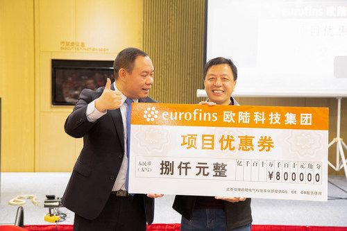 Eurofins欧陆大中华区总经理张剑(左)为获得一等奖的客户苏州正益凯电器有限公司(右)颁奖