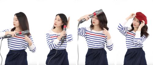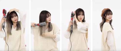 先搭配预造型风嘴,用戴森Airwrap美发造型器将头发吹到八成干;然后将配件替换为顺滑梳,通过气流将头发梳理顺直;之后使用40毫米的卷筒,顺、逆时针两个方向的卷筒分别对应左右两侧头发使用,打造自然卷发效果;最后用圆筒梳打造空气刘海,戴上百搭的大地色系贝雷帽,就能快速打造周末与朋友聚会派对的时髦造型。