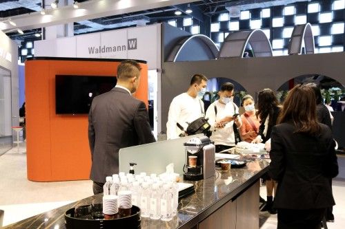 COFFICE也就是办公餐吧,展会特制的双侧高桌款便于招待贵宾,储物柜有强大的收纳功能。灰棕色陶瓷面板与尤加利实木贴面营造浓厚的复古风格,是整场中的吸睛单品之一。