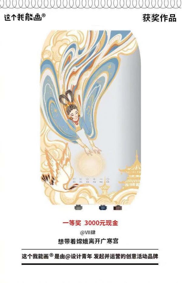 活动主题是“我和嫦娥有个约会”,所以我想,广寒宫的生活嫦娥可能已经厌倦了吧,我想带她离开那里,来人间玩一玩。因为活动是在速热热水器的表面作画,所以我将圆形的温度显示屏设计成月亮的样子,就像我们一个在人间一个在天宫,都看着同一个月亮,这是我们唯一的连接。
