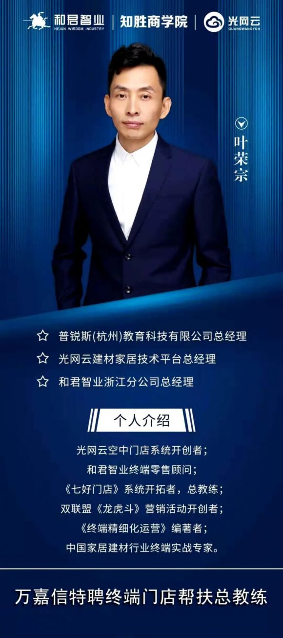 据说,为了办好本次大会,万嘉信木门特别邀请了和君智业的金牌老师叶荣宗,为参会的经销商做系统的培训。不仅仅是这次的培训,以后的打造超级大商计划,更是由叶老师团队亲自带队去开发市场,实战终端,让您从行业小白,成为专业老司机。叶老师的课程将全是营销干货,学到立马就可以用的,其口碑在行业内更是非常之好的。如能参会的经销商,肯定是一次大跃进,听完一定能秒杀隔壁老王。