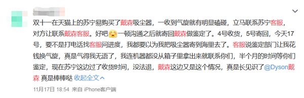 除了“低质高价”,戴森的“霸权售后”也让消费者难以接受。以结束不久的双十一为例,有网友发帖表示自己购买的戴森吸尘器收货时就发现气旋有明显瑕疵,几经周折联系售后,在完全没有使用的情况下,最终却被告知要付费更换气旋。对戴森而言,这样的“霸权售后”并不是孤例,在微博等社交平台上搜索"戴森售后"等关键词,也能够看到很多类似案例。