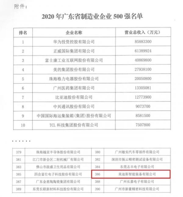 今年广东省制造业500强排名显示:华为投资控股有限公司、正威国际集团有限公司、富士康工业互联网股份有限公司列广东制造业企业500强前三位,美的、格力电器、广药、比亚迪、中兴通讯、中海运、TCL科技分列榜单第4-10位。