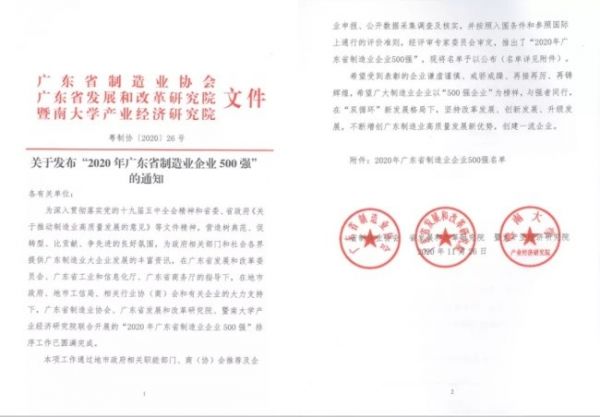 11月26日下午,由广东省制造业协会、广东省发展和改革研究院、暨南大学产业经济研究院主办的“2020广东省制造业发展年会暨广东省制造业500强企业峰会”在中山举行。