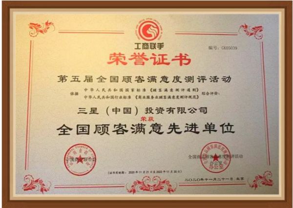 三星中央空调被授予“全国顾客满意先进单位”荣誉称号
