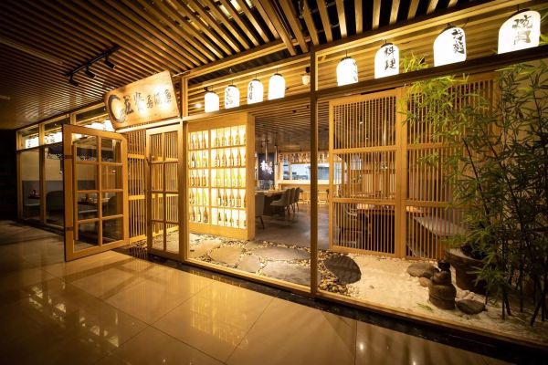空间整体以木结构贯穿,融入了日式枯山水元素、浮世绘元素、日式灯笼等,充分烘托日式氛围。