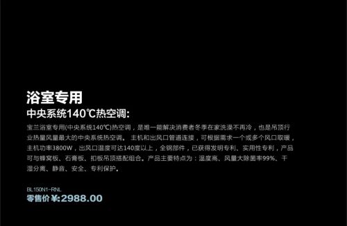宝兰浴室专用(中央系统140℃)热空调,是唯一能解决消费者冬季在家洗澡不再冷,也是吊顶行业热量风量最大的中央系统热空调。 主机和出风口管道连接,可根据需求一个或多个风口取暖,主机功率3800W,出风口温度可达140度以上,全钢部件,已获得发明专利、实用性专利,产品可与蜂窝板、石膏板、扣板吊顶搭配组合。