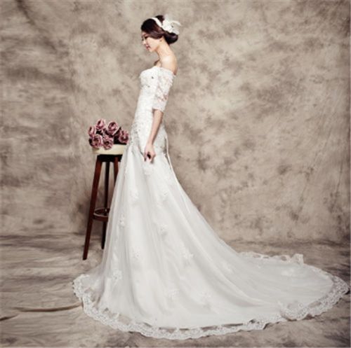 2、若说新娘的身材属于娇小的话建议还是选择齐地婚纱会比较好一些,因为拖地婚纱很有可能会凸显出新娘身高不足的一些缺点。