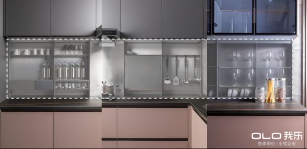 在门板上,我乐不断升级厨柜和全屋产品的门板工艺,使得产品更加经久耐用。比如我乐厨柜产品星云系列,它采用了高光UV工艺,经过紫外线固化后的门板防湿抗菌,尤其耐磨、好打理。