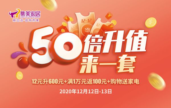 12月2日至11日,期间消费者凡登录集美家居小程序,即可在每日15:00准时抢购12元升600元升值套券,数量有限,抢完为止哦!