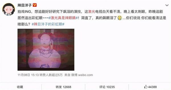 就在前不久,演员辣目洋子也发布微博吐槽激光电视“辣眼睛”,瞬间引发网友热议,上万条转发与评论里,网友各式吐槽质疑随处可见,相关话题阅读人数过亿。