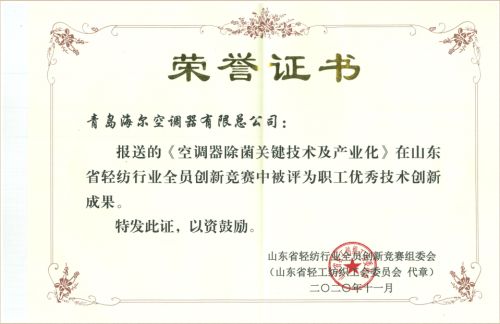 12月1日,海尔空调收到了一份荣誉,这次受表扬的是一群海尔人。他们创新的“空调器除菌关键技术及产业化”项目被评为山东省轻纺行业职工优秀技术创新成果。这也是获奖项目中仅有的一项关注到人们呼吸健康的创新成果。