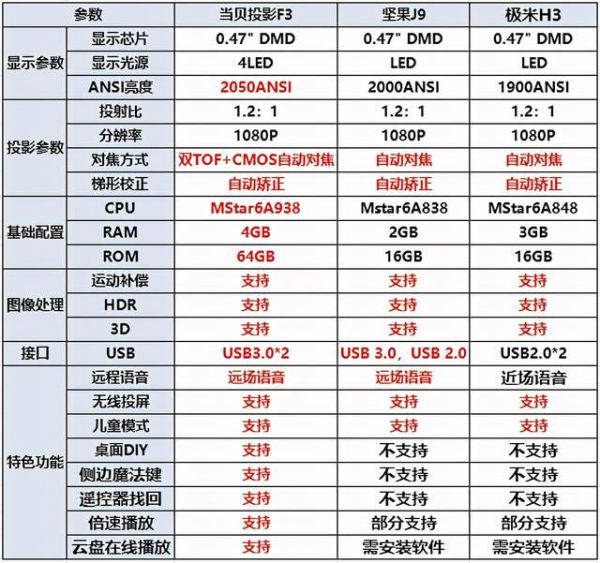 当贝投影F3的特色功能实在是太多了,所以在下面我再附上一张三款投影仪的性能对比图,供大家参考!