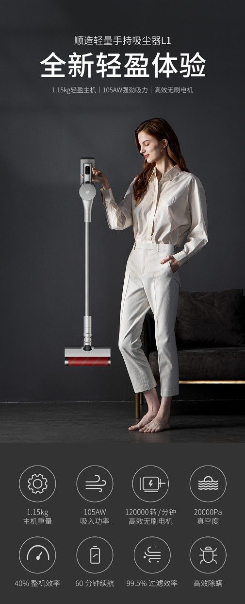 顺造轻量手持吸尘器L1,具有重量轻、性能强、多种人性化设计创新的特点,可以说是家居清洁主力军——女性朋友的贴心清扫利器,为大家带来全新轻盈的使用体验。