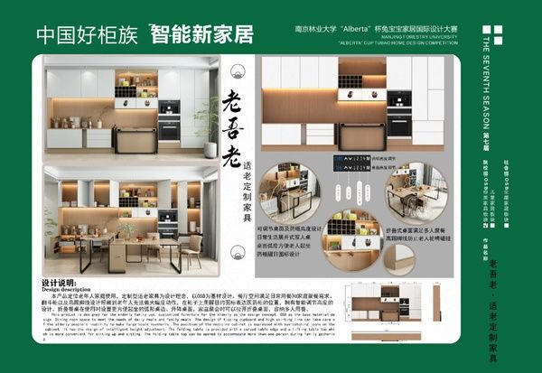 洪朝皇:“老吾老以及人之老”,这就是我的参赛作品的理念。本次大赛,我带来的作品是《老吾老·适老定制家居》,定位老年家庭实用,在空间内打造定制型适老家具,以OSB为基材。考虑到老年人肌肉萎缩、不发达等状况,不方便大幅度动作,我在设计中利用翻斗柜、高踢脚线、智能调节高度等设计,照顾老人特殊需求。柜体设计突出了医药柜区域,厨房餐桌融入智能调节高度设计,让老人能够自如、舒适的用餐、生活。希望本案能够让老年群体也能体面、轻松的生活。