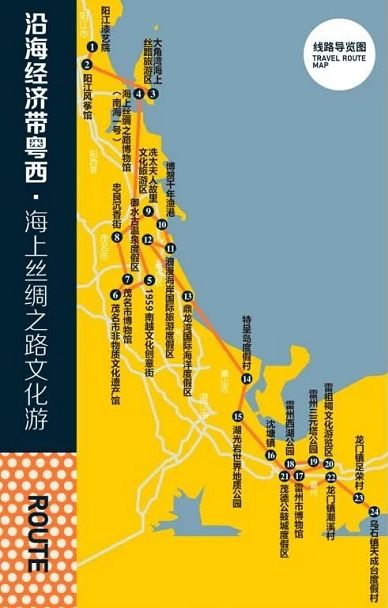 阳江(阳江漆艺院--阳江风筝馆--大角湾海上丝路旅游区--海上丝绸之路博物馆(南海一号)--茂名(1959南越文化创意街--茂名市非物质文化遗产馆--茂名市博物馆--忠良沉香街--冼太夫人故里文化旅游区--博贺千年渔港--浪漫海岸国际旅游度假区--御水古温泉度假区)--湛江(鼎龙湾国际海洋度假区--特呈岛度假村--湖光岩世界地质公园--沈塘镇--雷州市博物馆--雷州西湖公园--雷州三元塔公园--雷祖祠文化游览区--茂德公鼓城度假区--龙门镇潮溪村--龙门镇足荣村--乌石镇天成台度假村)。