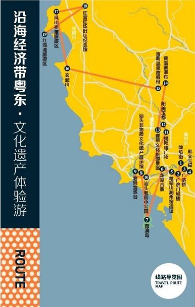潮州(牌坊街--广济门城楼--广济桥--韩文公祠--笔架山潮州窑遗址--龙湖古寨)--汕头(南澳岛--汕头非物质文化遗产展示馆--老妈宫戏台--汕头老街小公园)--揭阳(揭阳楼广场--阳美玉都--青狮文化旅游景区--黄满寨瀑布--京明温泉度假村)--汕尾(玄武山--凤山祖庙旅游区--红宫红场旧址纪念馆--红海湾旅游区)。