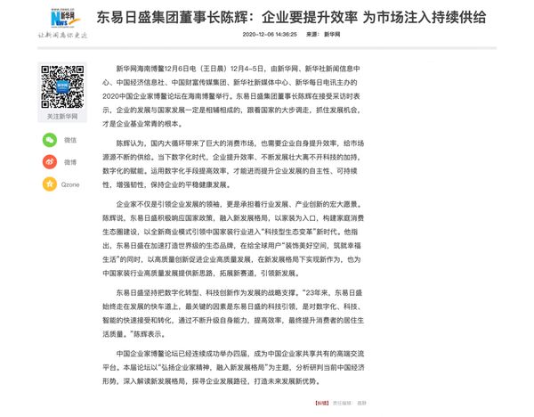 由新华网、新华社新闻信息中心、中国经济信息社、中国财富传媒集团、新华社新媒体中心、新华每日电讯主办的2020中国企业家博鳌论坛在海南博鳌举行。东易日盛集团董事长陈辉在接受采访时表示,企业的发展与国家发展一定是相辅相成的,跟着国家的大步调走,抓住发展机会,才是企业基业常青的根本。