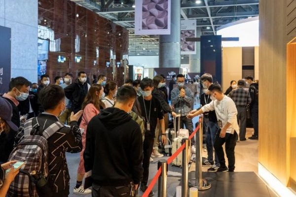 在保利世贸博览馆6A10,西舞定制场馆门口人潮涌动。本次场馆为半开放式设计,深灰色和原木色为主色调,无论整体造型或家具都呈现出强烈的现代简约风格,十分贴近现代生活。
