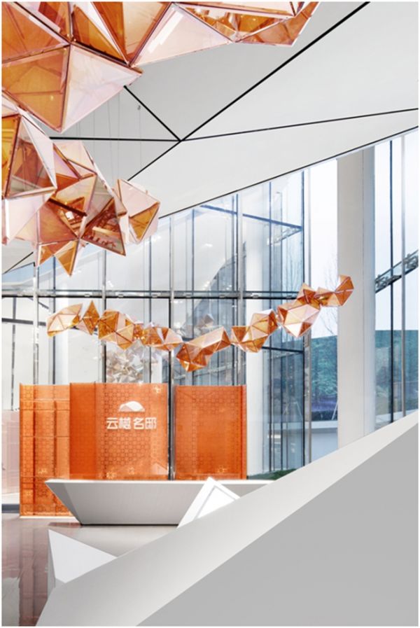 因循地势地貌,建筑外观极具特色。依地势下沉,又如山之形,似破土而出。从入口进,经阶梯往下步,途遇水榭,建筑屋顶与小区外路面齐平,屋顶种植草坪,从高处俯瞰,形隐于绿色的植被和水景之间。夜间,室内灯火如皎洁月光,建筑外形似远处斜山,一抹暖橙色,如晚霞余晖,指引归家的行人。
